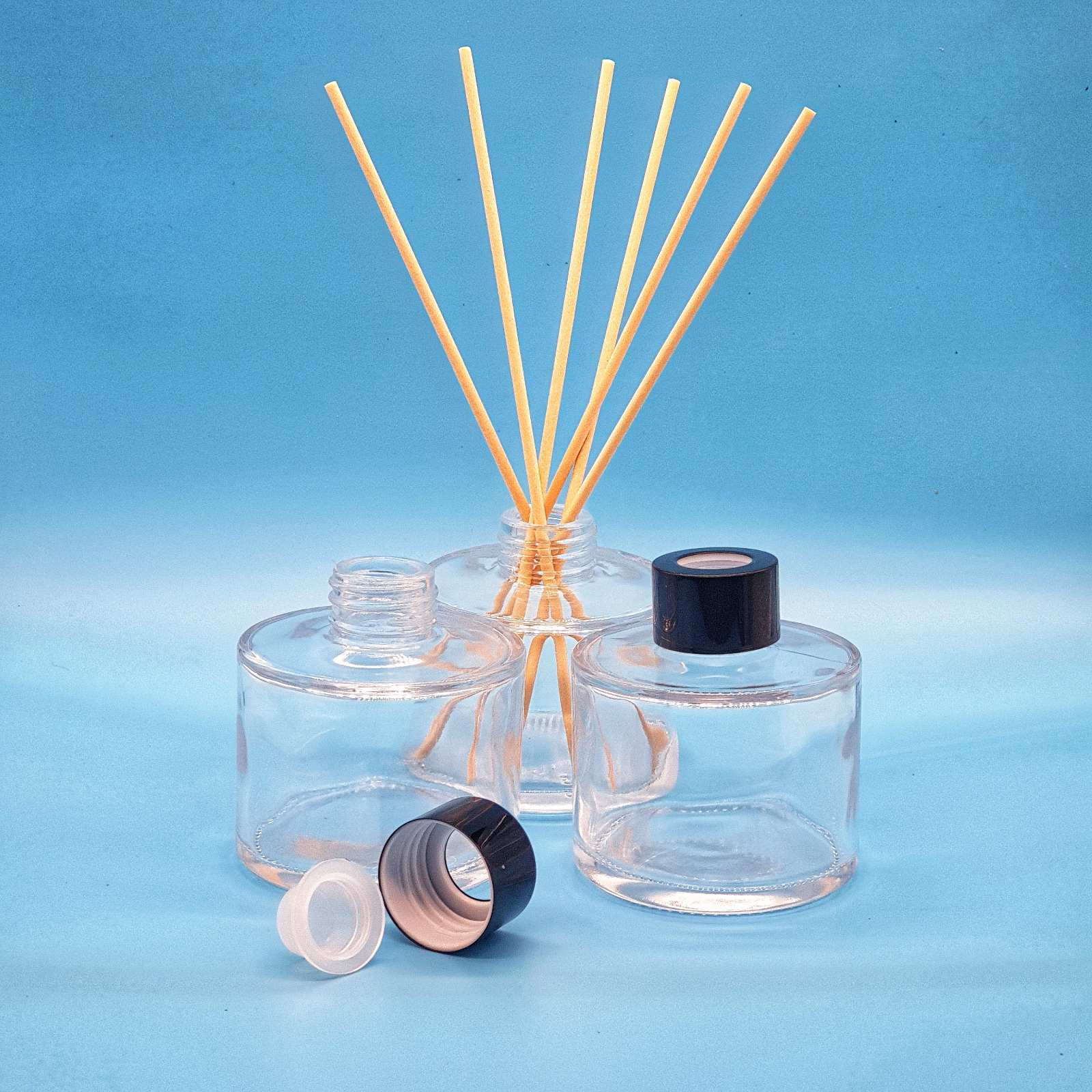 Стекло 100 мл цвет прозрачный, внутренняя пластиковая заглушка, алюминиевая черная крышка. Ротанговые палочки в комплект не входят!