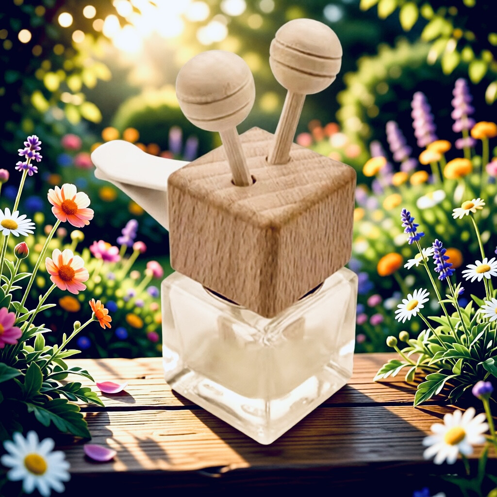 Автомобильный диффузор с креплением на дефлектор: прозрачный флакон 7 мл, крышка из натурального бука и палочки для диффузии.